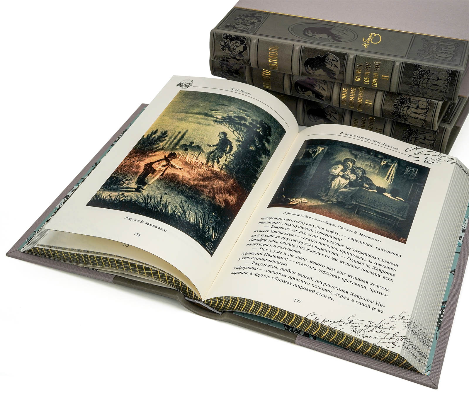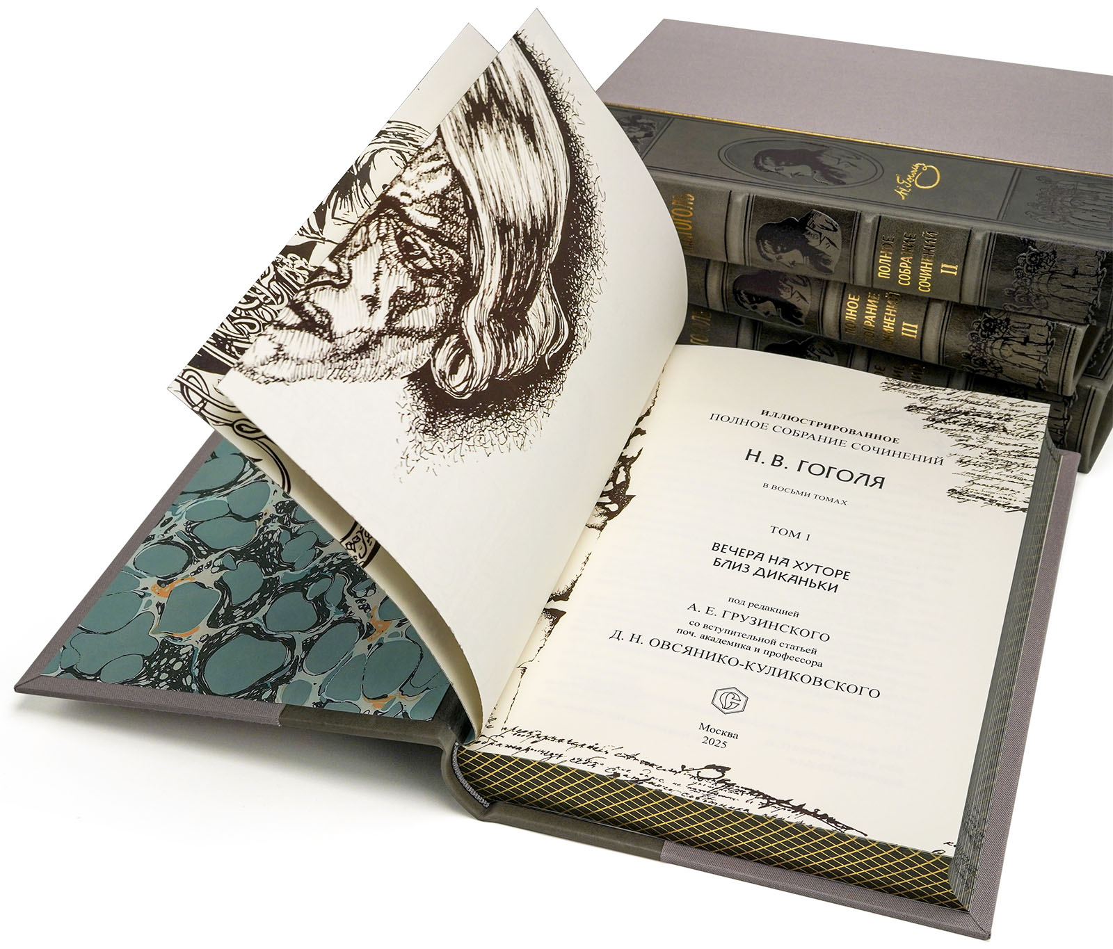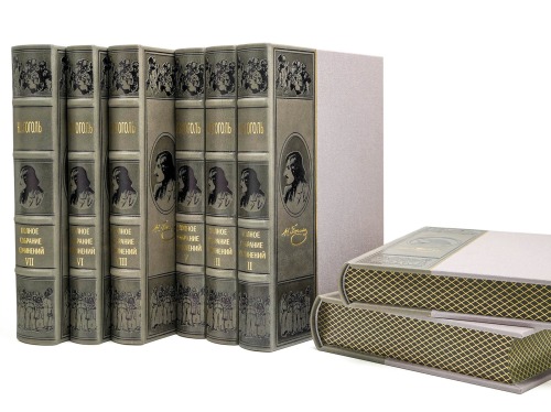 Подарочное иллюстрированное собрание сочинений Н.В. Гоголя в роскошном кожаном переплёте – идеальный выбор для ценителей шедевров русской литературы и тех, кто формирует уникальную домашнюю библиотеку. Этот изысканный комплект станет отличным подарком для особого человека. Книга создана по традиционной технологии составного переплета и украшена элегантным тиснением золотой фольгой в сочетании с конгревным (объемным) эффектом. Ручная шлифовка и золотой узор на обрезах страниц создают неповторимый внешний вид. Форзац выполнен из дизайнерской бумаги, окрашенной вручную.