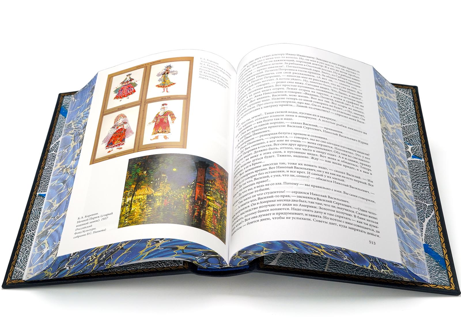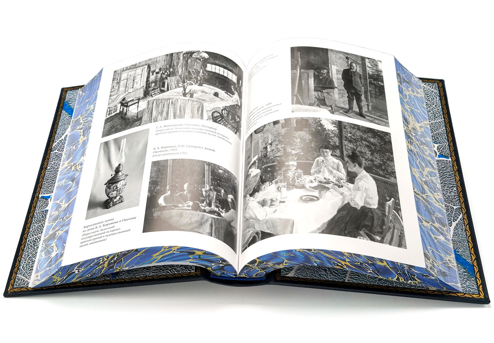 Подарочное издание Константина Коровина «То было давно... там... в России...» — это уникальный эксклюзивный набор, состоящий из двух томов, оформленный в великолепном кожаном переплете в историческом французском стиле. Каждая книга отличается уникальным тиснением, а книжные блоки вручную отшлифованы и обрезаны с тонировкой в стиле мраморной бумаги, что подчеркивает качество ручной работы.