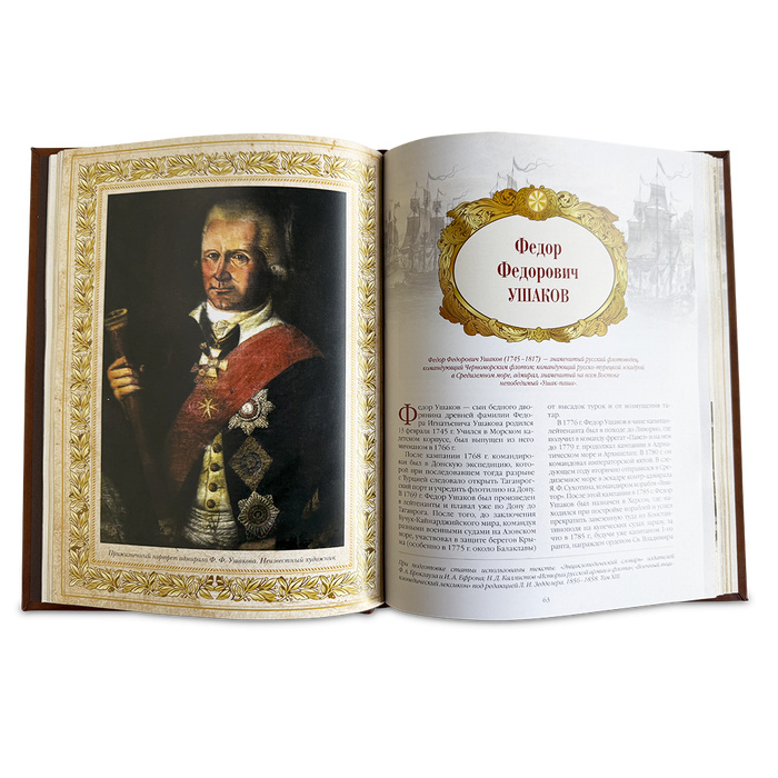 Особое внимание уделено художественному литью и бюсту Ушакова, а также фольгированному и художественному тиснению по коже на обратной стороне обложки. Кожаный переплет ручной работы подчеркивает индивидуальность каждой книги, а трехсторонний золотой обрез придает дополнительную роскошь. Подарите этот уникальный экземпляр, чтобы познакомиться с судьбами великих творцов и насладиться увлекательной экскурсией по восьми столетиям военной славы. Оформите заказ прямо сейчас!