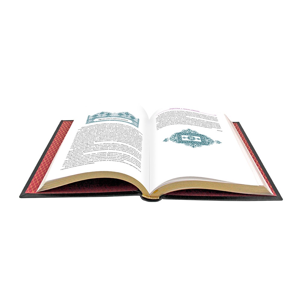 Книга имеет 6 бинтов на корешке, выполненных вручную, а каптал из натуральной кожи и обрез блока с золотым торшонированием делают её ещё более привлекательной. Тиснение блинтовое, выполненное золотой и цветной фольгой, а также изящная ляссе придают этому изданию завершённый вид.