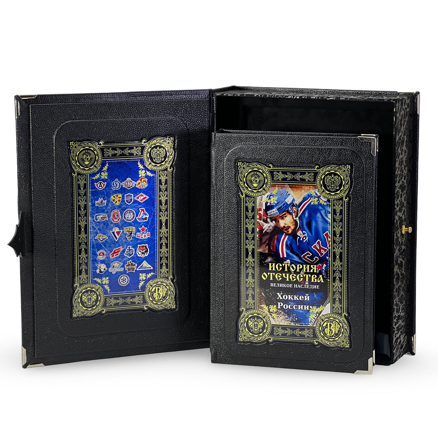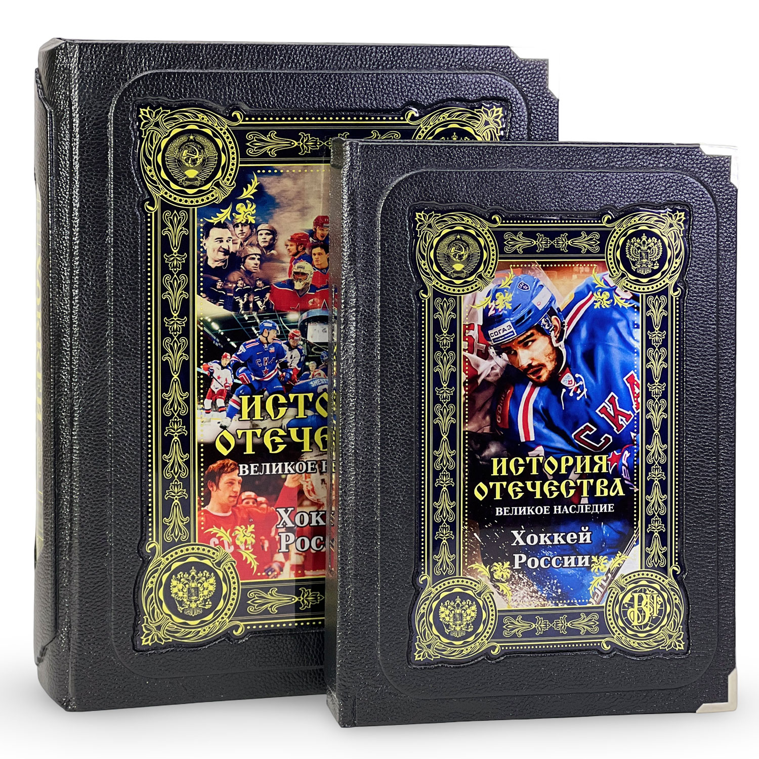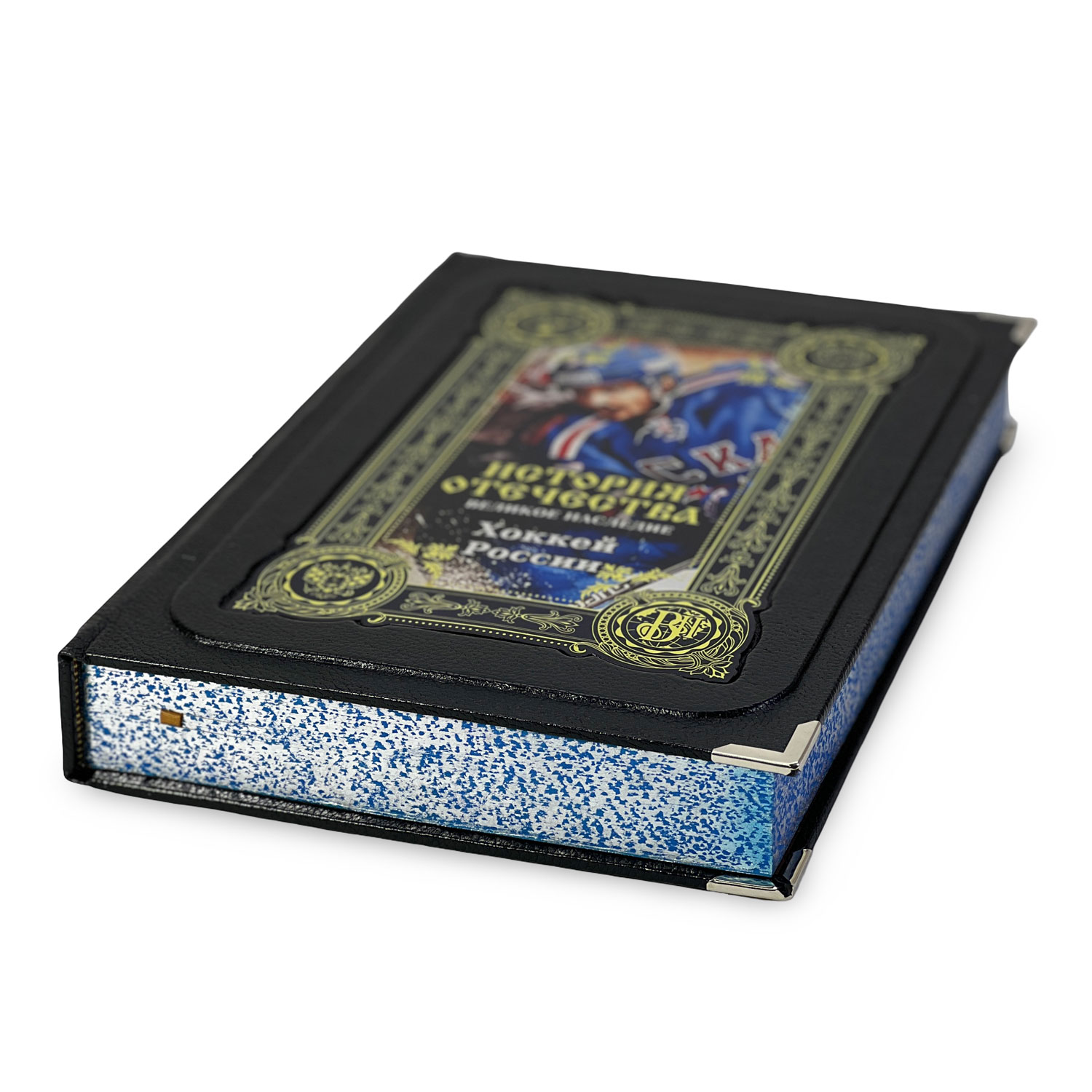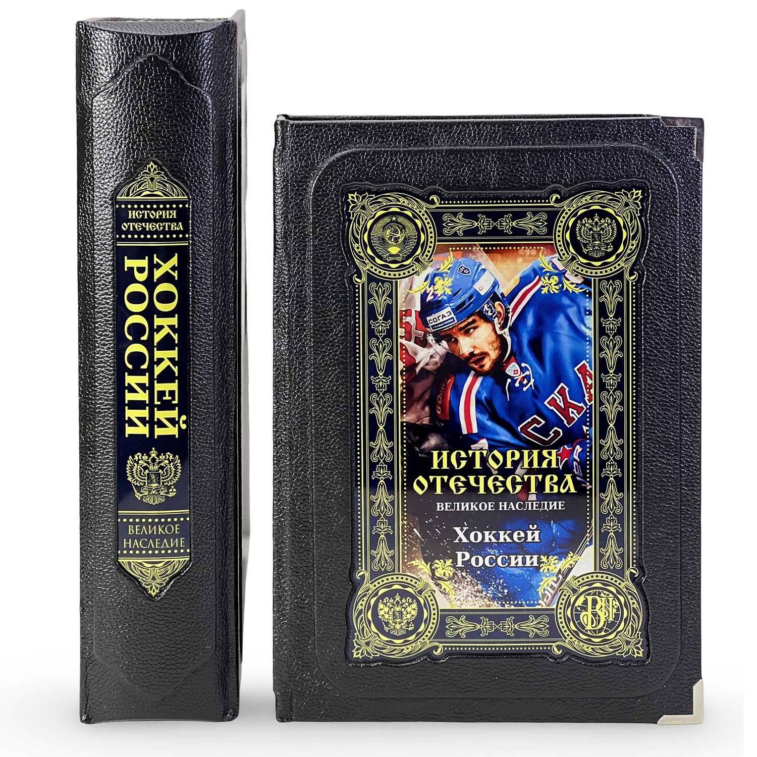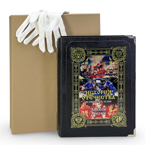 Подарочное издание в кожаном переплете «Хоккей России». Книга отпечатана на дизайнерской бумаге с тематическим оформлением, проделана кропотливая работа по разработке уникальных клише для создания данного стиля рисунка на коже.