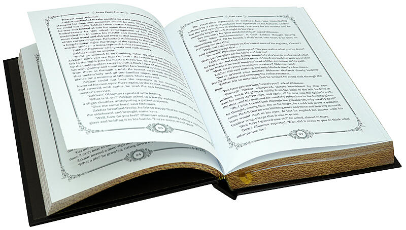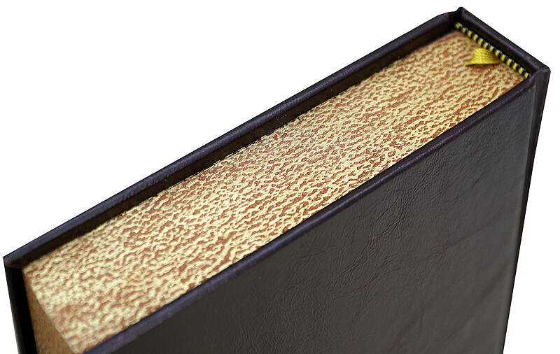 Экземпляр отличается французским композитным переплётом ручной работы, выполненным из натуральной кожи премиального качества. Материалы обложки — кожа "Gabinetto Brown" и "Iguano", которые изготавливаются на знаменитой итальянской кожевенной фабрике Benericetti, что подчеркивает статусность подарка премиум-класса. Особое внимание заслуживает оформление: золотое рельефное тиснение придаёт изысканный блеск, а полировка обреза блока вручную, выполненная по уникальной методике "Хамелеон", превращает издание в настоящее произведение искусства.