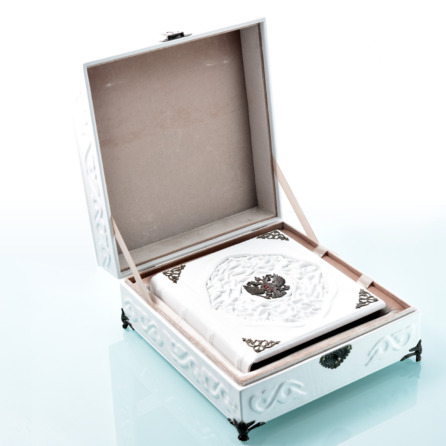 В качестве материалов для оформления использованы натуральная кожа и художественное литьё, что придает изданию статус эксклюзива. Качественная мелованная бумага и цветные иллюстрации обеспечивают высокое полиграфическое исполнение каждого экземпляра.