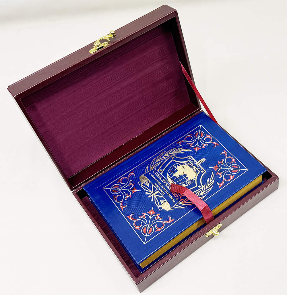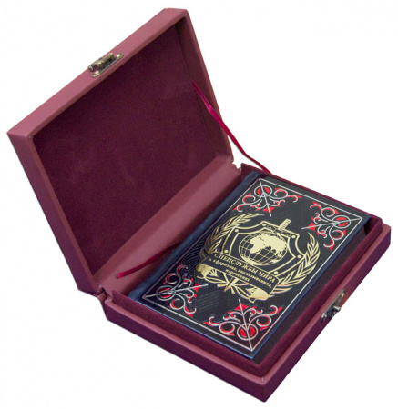 Оформление: Тиснение блинтом, золотой, серебряной и красной фольгой, подарочный пенал