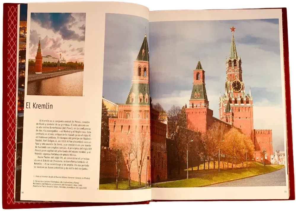 Книга "Москва" на испанском языке - иллюстрированный альбом с видами Москвы. Москва... Само звучание этого слова исполнено величавой, былинной силы. Оно словно излучает энергетический импульс, подобный блеску золотых куполов храмов и окладов чудотворных икон. Звездный свет, осеняющий Москву, не угасал во все времена, и ныне, в начале XXI века, над Москвой "великой, златоглавой" вновь звучат колокола древних храмов. Это торжественный "глагол времен", вобравший в себя колоссальную энергию прошлого и предвещающий неотвратимый будущий взлет. В этом голосе Москвы, как и во всем ее образе, сокрыты коренная сила России, ее уверенность в одолении избранного трудного пути, ее смелая устремленность в грядущее.