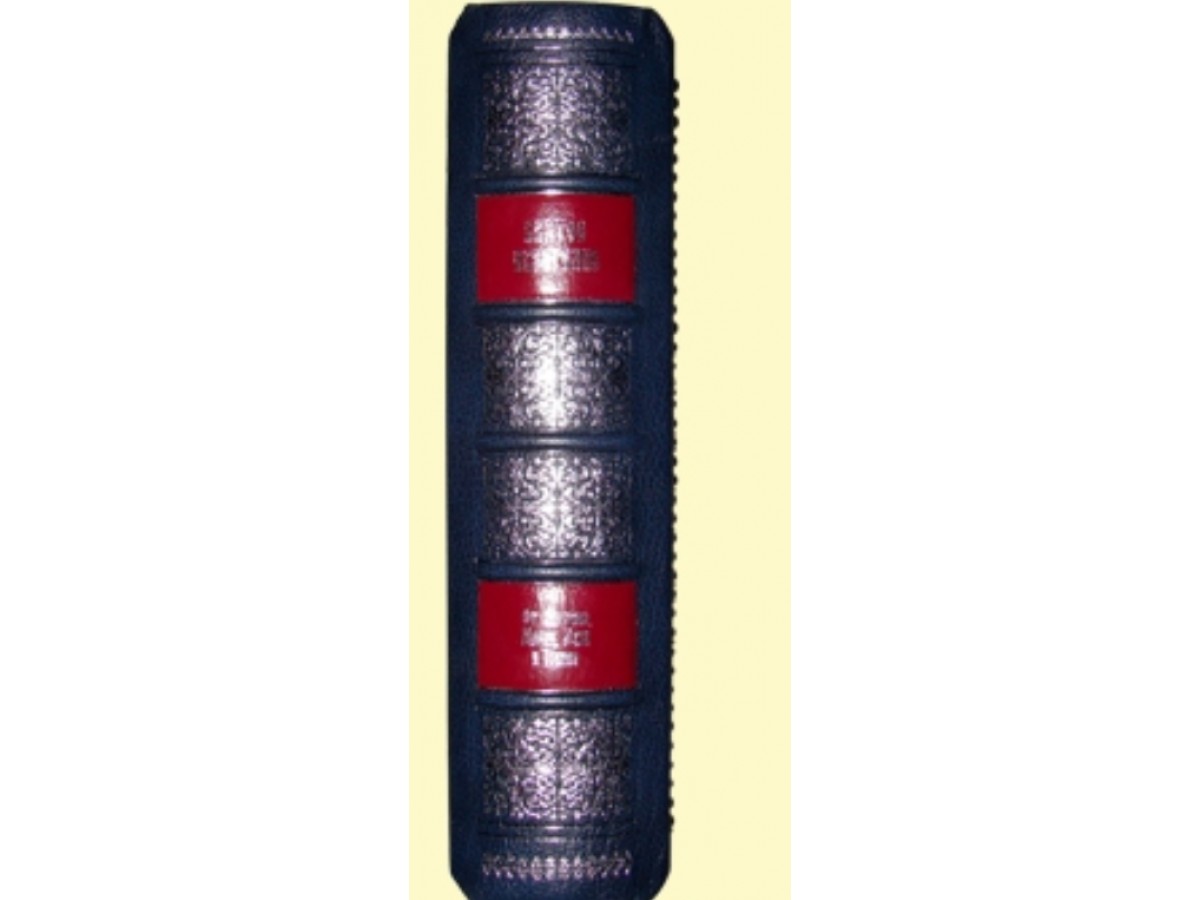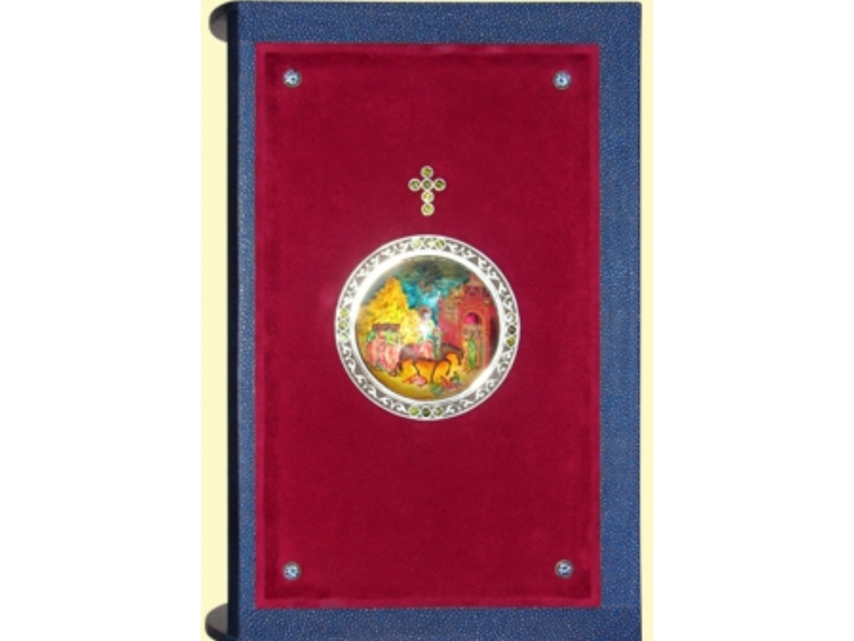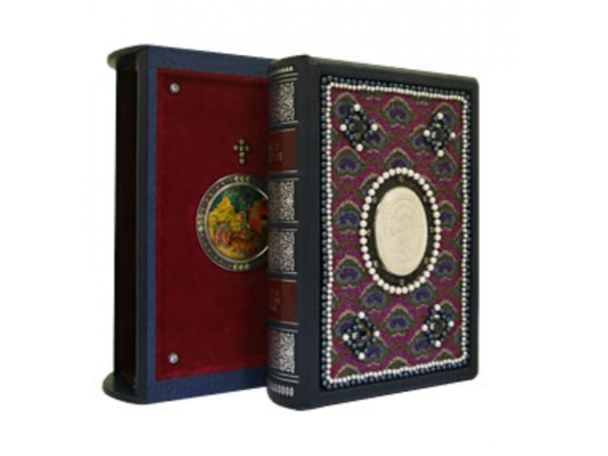 Переплет изготовлен из натуральной итальянской синей кожи методом ручной работы с использованием трех шнуров и капталом из шелка ручного плетения. Форзац оформлен на кожаной слизуре, а тиснение серебряной фольгой добавляет изящество. Обрез полирован и окрашен, а лаковая роспись выполнена мастерами Федоскино. Художественная рельефная резьба выполнена по моржовому зубу, добытому в Архангельске.