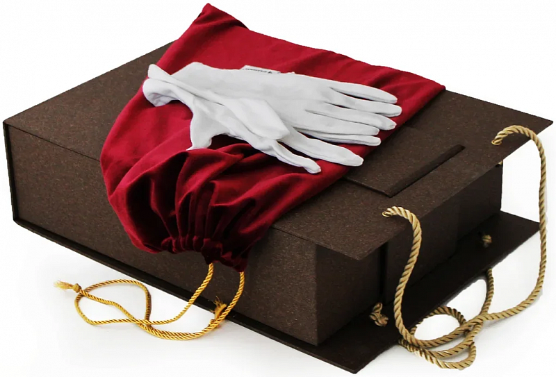 Книга представлена в кожаном футляре, вдохновлённом её дизайном, и упакована в оригинальный подарочный короб. В комплект входят перчатки для бережного обращения с книгой, а также сертификат, который может стать именным по вашему желанию.