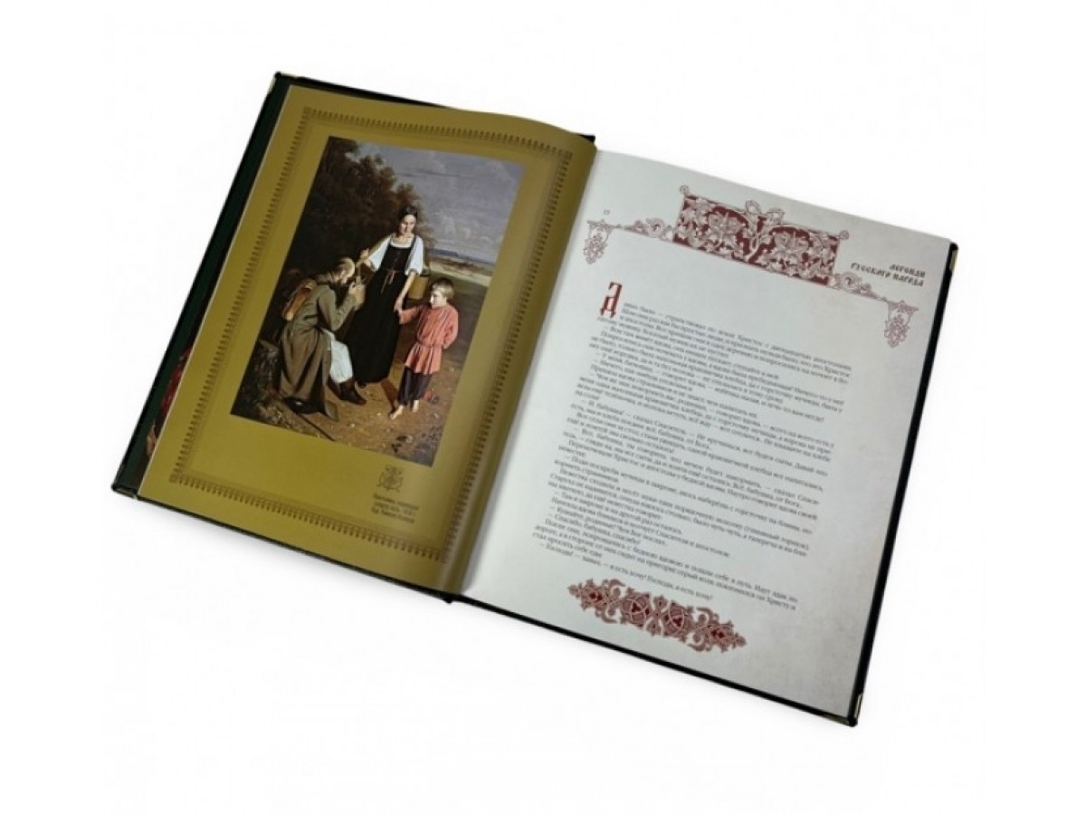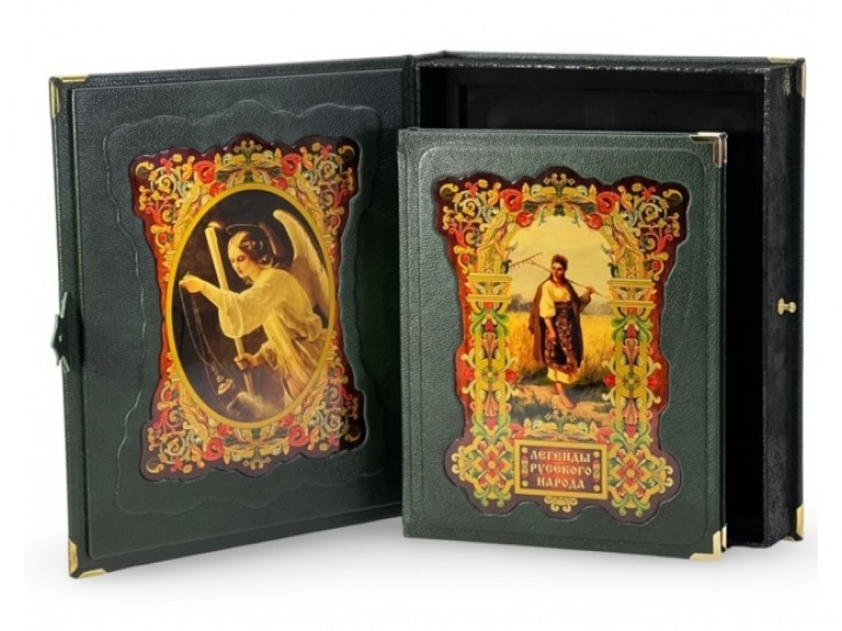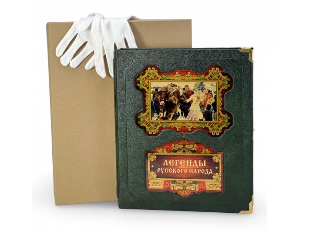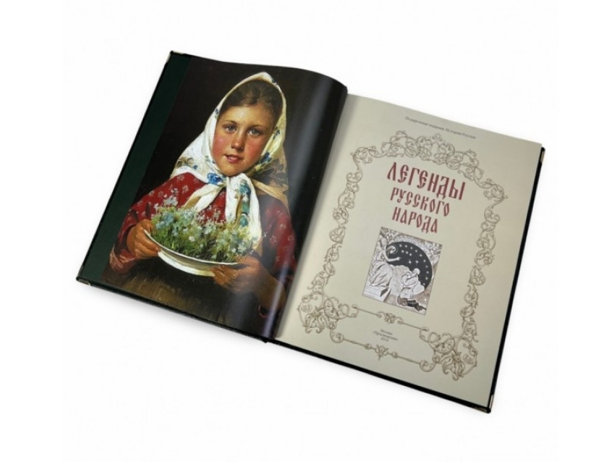 В этой уникальной книге вы найдете воспоминания о моментах истории, перенесенные в русские легенды и предания, которые по своему значению и увлекательности не уступают народным сказкам. Книга выполнена в цельнокожаном переплете ручной работы с элегантной иллюстрированной вставкой из цветного металла. Двухуровневая обложка и металлические уголки обеспечивают не только стильный вид, но и защиту при использовании. Текст напечатан на мелованной бумаге и украшен яркими цветными иллюстрациями, а обрез книги оформлен художественным изображением и украшен ляссе из шёлковой ленты — все это делает издание поистине уникальным.