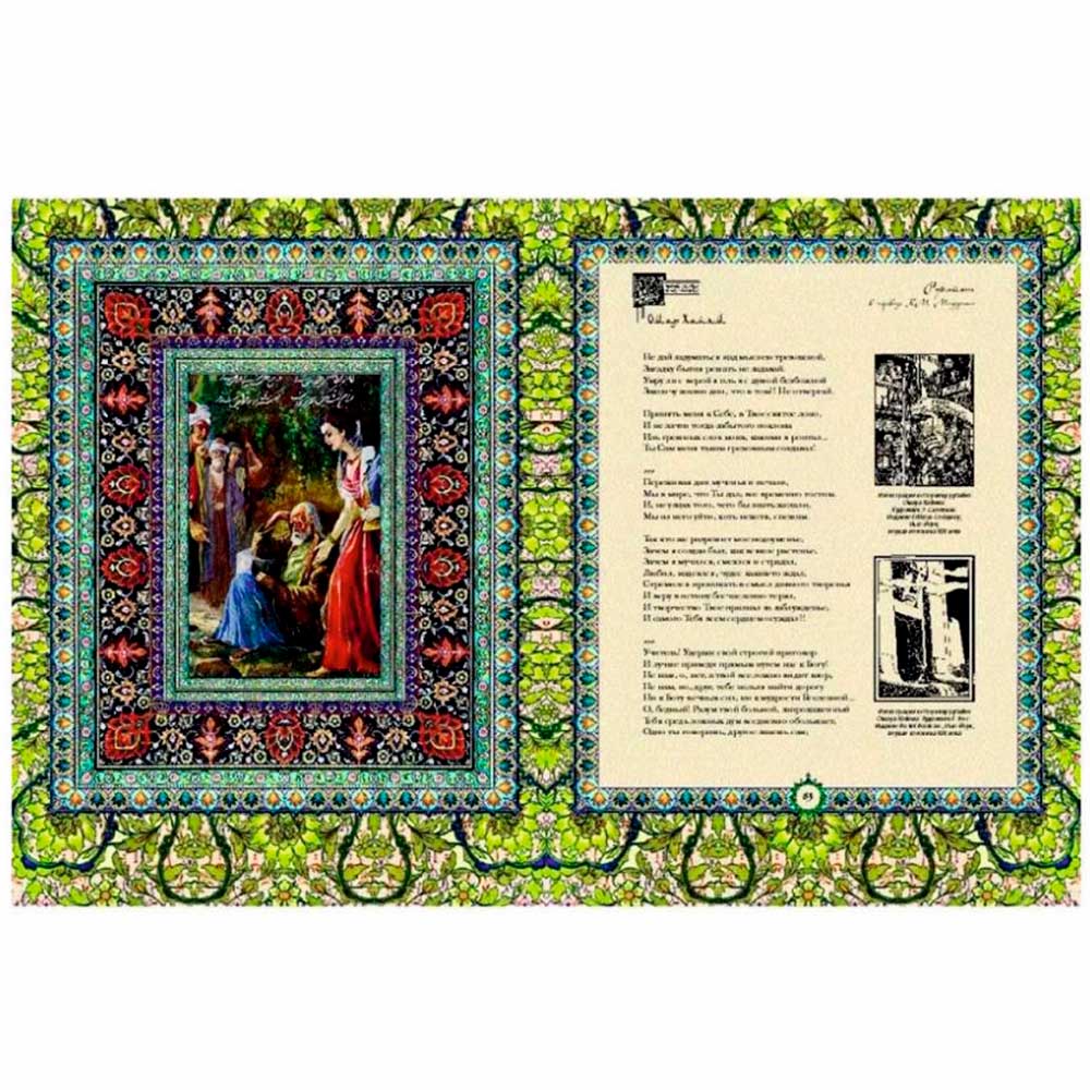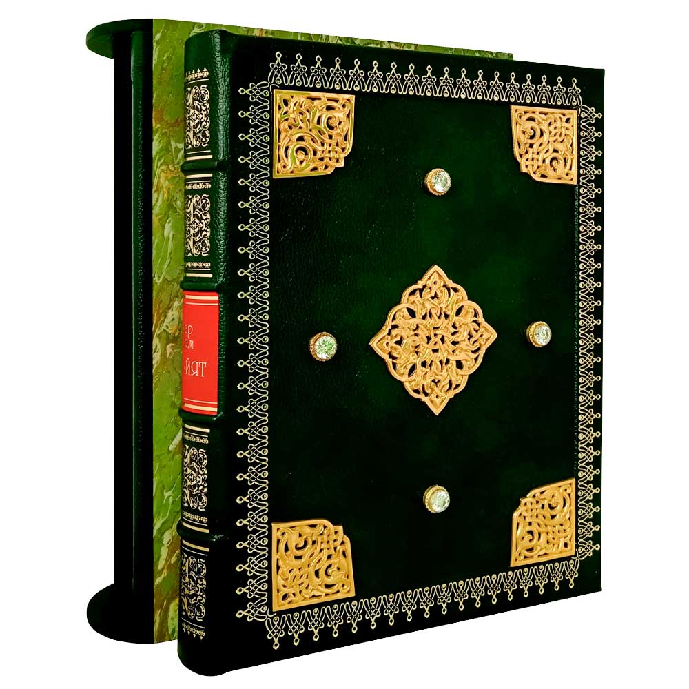 Роскошно оформленое подарочное издание "Рубайят. Омар Хайям" в футляре. Французский цельнокожаный переплет ручной работы на шнурах. Натуральная переплетная кожа. Цвет Темно-зеленый. Форзац составной на кожаной слизуре. Каптал двойной наборный, ручное плетение из шелковых нитей. Обрез торшонированный золотой фольгой. Ляссе шелковое. Украшение переплета: тиснение полиграфической фольгой. Ювелирные накладки: Художественное литье-латунь, золочение. Ювелирные вставки: натуральные камни, фианиты. Подарочный футляр.