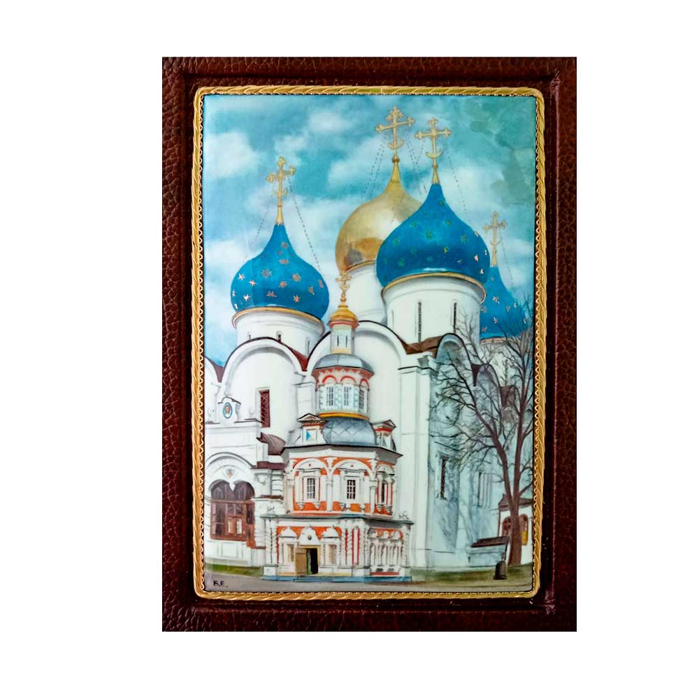 Французский цельнокожаный переплет ручной работы на шнурах придает изданию статус коллекционного объекта. Использована натуральная переплетная кожа и составной форзац на кожаной слизуре. Эстетический акцент сделан на дизайнерской бумаге, вручную сплетенном каптале из шелковых нитей, а также золотом обрезе – торшонированном с применением фольги. Ляссе выполнено из шелка, тиснение украшено полиграфической фольгой. Обложка дополнена накладными элементами – ручная роспись по эмали, филигранная рамка и золочение подчеркивают высокое качество исполнения книги.