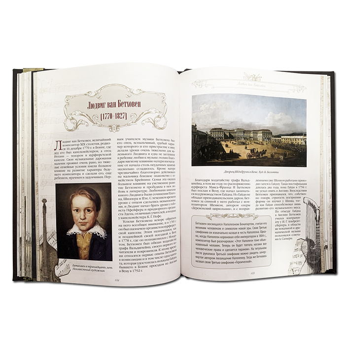 Каждая история наполнена глубиной, позволяя по-новому взглянуть на их музыка и культурное наследие. Исключительная художественная вставка с фотопечатью на коже, изображающая портреты композиторов, придаёт книге особый шарм. Трехсторонний золотой обрез и качественная мелованная бумага с цветными иллюстрациями делают это издание настоящим произведением искусства, которое будет радовать глаз и вдохновлять на протяжении многих лет.