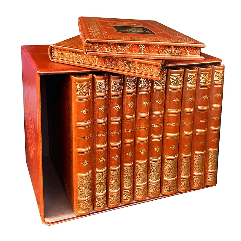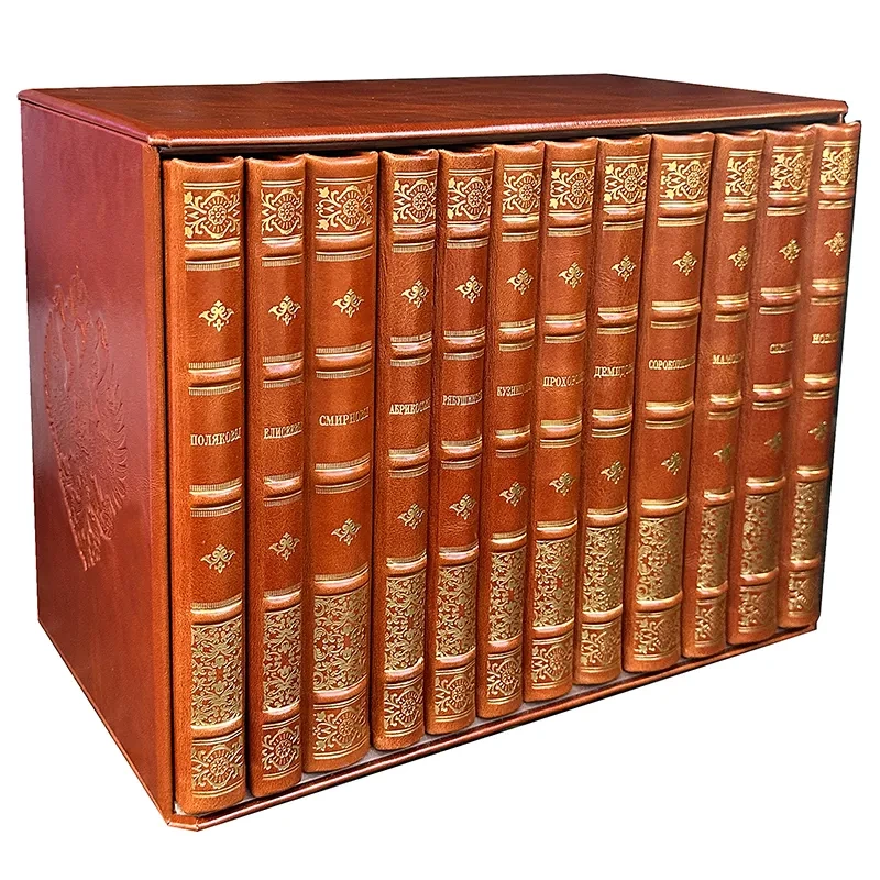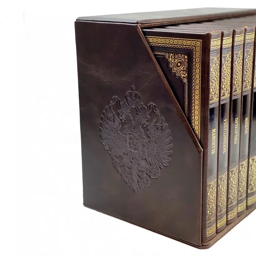 Это эксклюзивное издание неизменно привлекает внимание благодаря своему великолепному оформлению. Цельнокожаный переплёт, выполненный вручную, украшен золотым тиснением и элегантными бинтами. Исключительное качество книг обеспечивается текстом, напечатанным на офсетной бумаге с художественно оформленным обрезом. Ляссе, сделанное из шёлковой ленты, а также форзац из дизайнерской бумаги и дублюра, окатанная золотом, добавляют дополнительный шик.