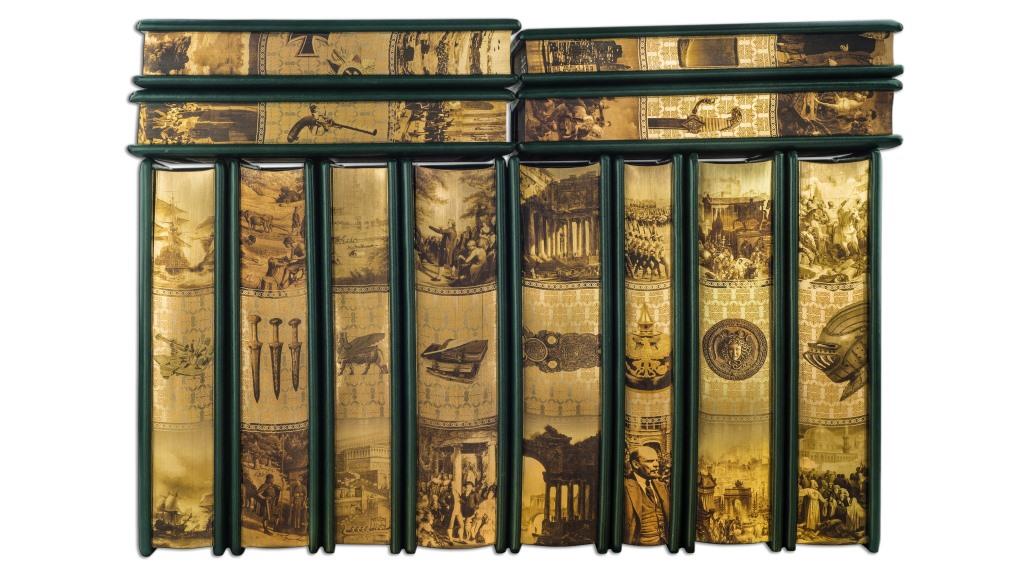 комбинации натуральной кожи (кожа «Gabinetto Green», кожа «Marma Rossa» производства итальянской кожевенной фабрики «Benericetti»). Обложка книги оформлена золотым и серебряным тиснением, с использованием фольги «Luxor 240». Обрез книг выполнен в уникальной технологии художественной запечатки золотой основы. Количество страниц – 9596стр. (офсетная бумага, черно-белая печать, иллюстрации). Средний формат книги – 205х270х56мм. Вес комплекта – 27кг.