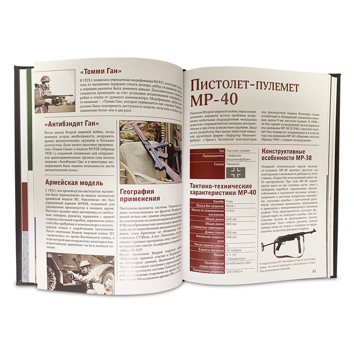Каждый экземпляр дополнен наглядными таблицами и схемами, что позволяет легко сопоставлять различные модели и глубже погружаться в их уникальные особенности, которые сделали их легендарными. Оформление книги отличает художественное литье и тиснение, обработанное затертыми золотистыми пастами, что добавляет ей уникальности. Трехсторонний золотой обрез и мелованная бумага с яркими иллюстрациями делают эту книгу идеальным подарком для ценителей истории оружия.