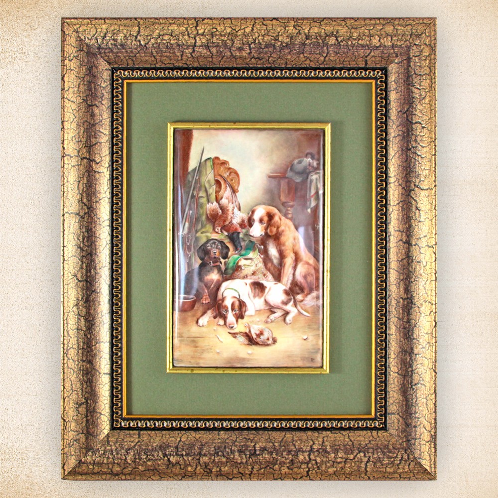 Работа оформлена в элегантный багет, что добавляет завершённости образу и позволяет изделию гармонично вписаться в любой интерьер. Данная картина станет эксклюзивным украшением для коллекционеров, а также отличным подарком для ценителей национальных традиций и любителей собак. В композиции отражена атмосфера настоящей охотничьей сцены — сочетание движения, природы и животных, что делает произведение особенно привлекательным для людей, увлечённых активным образом жизни и искусством.