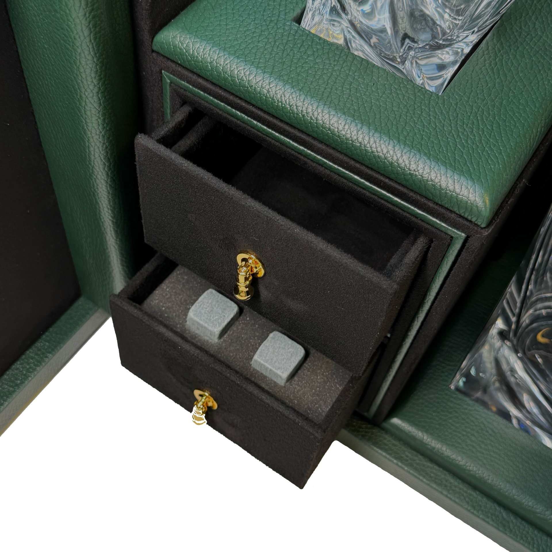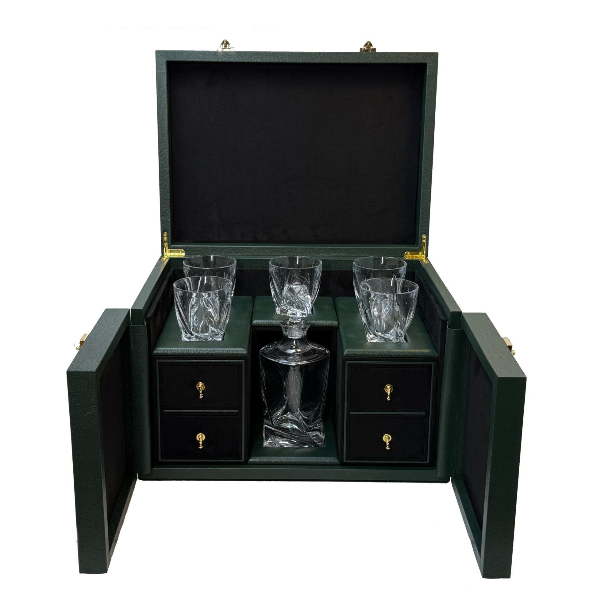 Эксклюзивное оформление изделия подчёркивается фурнитурой из Италии в цвете золото, что добавляет статусности и подчеркивает высокий уровень исполнения. Кроме того, бар оборудован двумя дополнительными ящиками для хранения полезных мелочей, что обеспечивает максимальный комфорт и удобство использования. Этот интерьерный-бар с набором для виски — идеальный изысканный подарок для ценителей благородных напитков, которые ценят качество и эстетическую привлекательность предметов в своём доме или кабинете.