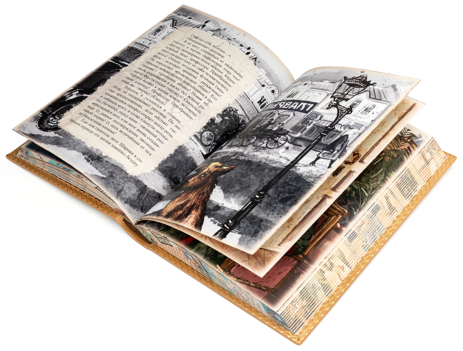 Эта подарочная книга оформлена в историческом французском стиле с кожаным переплетом, рельефным и цветным тиснением. Каждая страница проработана вручную, книжный блок сшит и шлифован, а обрезы украшены тематическими рисунками. Использована дизайнерская бумага "Ozon Ivory" для ещё большего впечатления от чтения. Подарочная книга "Собачье сердце" станет отличным выбором как для ценителей классической литературы, так и для тех, кто хочет иметь уникальный экземпляр в своей библиотеке.