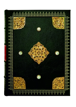 Французский переплет из натуральной кожи выполнен с тщательной ручной работой на шнурах. Отличительной чертой является темно-зеленый цвет и составной форзац на кожаной слизуре. Каптал изготовлен в двойном наборе с ручным плетением из шелковых нитей, а обрез украшен золотой фольгой. Ляссе выполнено из шелка, а украшение переплета осуществлено с помощью тиснения полиграфической фольгой. Более того, издание украшают ювелирные накладки из латуни с золочением и вставки из натуральных камней и фианитов. Все это делает "Рубайят" Омара Хайяма не просто книгой, а настоящим произведением искусства, заключенным в подарочный футляр.